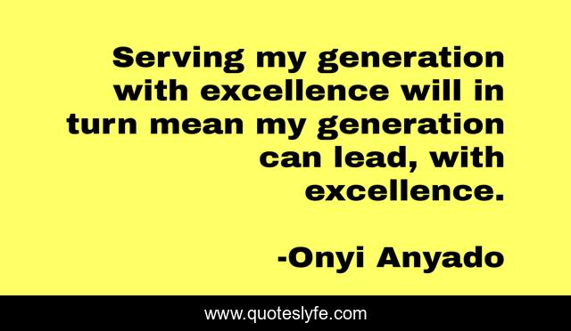 This page presents the quote "Serving my generation with excellence will in turn mean my generation can lead, with excellence.". Author of this quote is Onyi Anyado. This quote is about serving-others, leadership-development, quote-of-the-day, serving-the-people, leadership, onyi-anyado, distinction, quotes-to-live-by,.