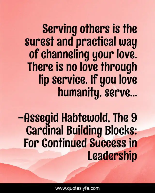 This page presents the quote "Serving others is the surest and practical way of channeling your love. There is no love through lip service. If you love humanity, serve…". Author of this quote is Assegid Habtewold, The 9 Cardinal Building Blocks: For Continued Success in Leadership. This quote is about love, service, serve, humanity, affection,.