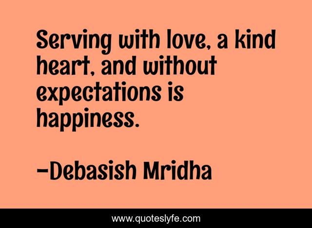 This page presents the quote "Serving with love, a kind heart, and without expectations is happiness.". Author of this quote is Debasish Mridha. This quote is about heart, kind, serving, love, knowledge, inspirational, intelligence, philosophy, education,.
