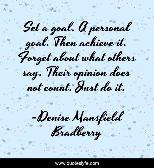 This page presents the quote "Set a goal. A personal goal. Then achieve it. Forget about what others say. Their opinion does not count. Just do it.". Author of this quote is Denise Mansfield Bradberry. This quote is about inspirational-attitude, enthusiasm, inspirational,.