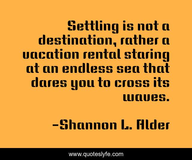This page presents the quote "Settling is not a destination, rather a vacation rental staring at an endless sea that dares you to cross its waves.". Author of this quote is Shannon L. Alder. This quote is about challenges, ocean, destinations, living, confidence, unexpected-changes, destination, changing-weather, live-with-purpose,.