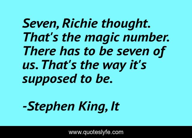 This page presents the quote "Seven, Richie thought. That's the magic number. There has to be seven of us. That's the way it's supposed to be.". Author of this quote is Stephen King, It. This quote is about king, seven, magic, horror, lucky, number, stephen, pennywise, it,.
