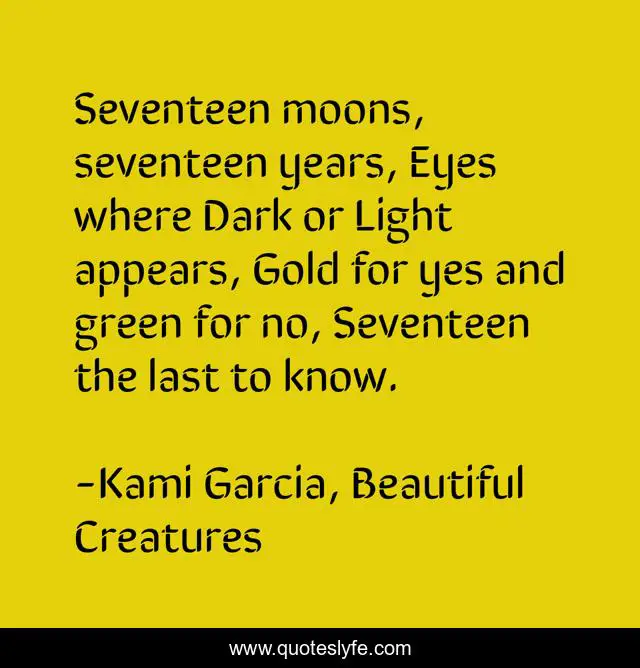 This page presents the quote "Seventeen moons, seventeen years, Eyes where Dark or Light appears, Gold for yes and green for no, Seventeen the last to know.". Author of this quote is Kami Garcia, Beautiful Creatures. This quote is about beautiful, beautiful-creatures, ending, quotes, caster, kami-garcia, caster-chronicles, creatures,.