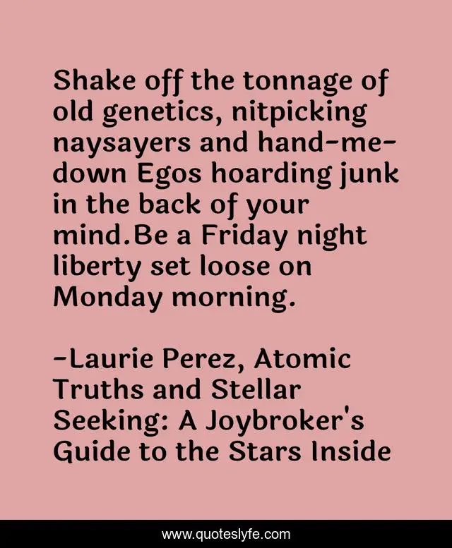 This page presents the quote "Shake off the tonnage of old genetics, nitpicking naysayers and hand-me-down Egos hoarding junk in the back of your mind.Be a Friday night liberty set loose on Monday morning.". Author of this quote is Laurie Perez, Atomic Truths and Stellar Seeking: A Joybroker's Guide to the Stars Inside. This quote is about genetics, destiny, fearless, limitless, creativity, expansion, ego, purpose, rebel,.