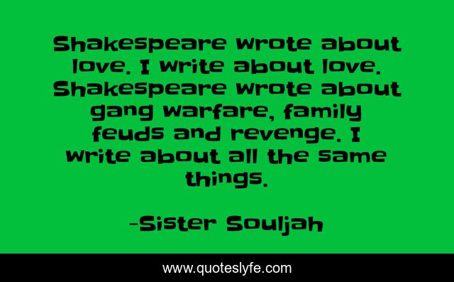 This page presents the quote "Shakespeare wrote about love. I write about love. Shakespeare wrote about gang warfare, family feuds and revenge. I write about all the same things.". Author of this quote is Sister Souljah. This quote is about love, revenge, affection, same,.