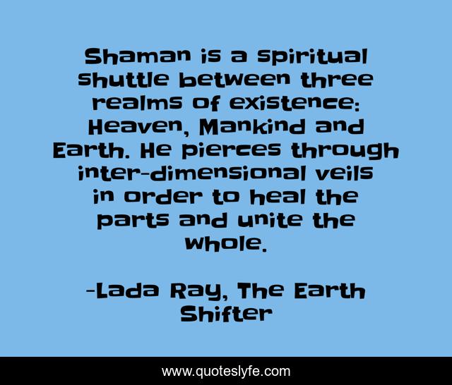 This page presents the quote "Shaman is a spiritual shuttle between three realms of existence: Heaven, Mankind and Earth. He pierces through inter-dimensional veils in order to heal the parts and unite the whole.". Author of this quote is Lada Ray, The Earth Shifter. This quote is about dimensions, spirituality, oneness, healing, realms, shaman,.
