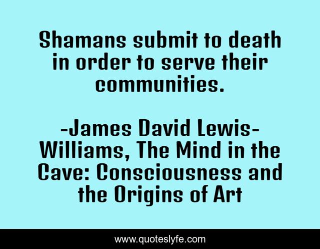 This page presents the quote "Shamans submit to death in order to serve their communities.". Author of this quote is James David Lewis-Williams, The Mind in the Cave: Consciousness and the Origins of Art. This quote is about upper-palaeolithic-art, consciousness,.