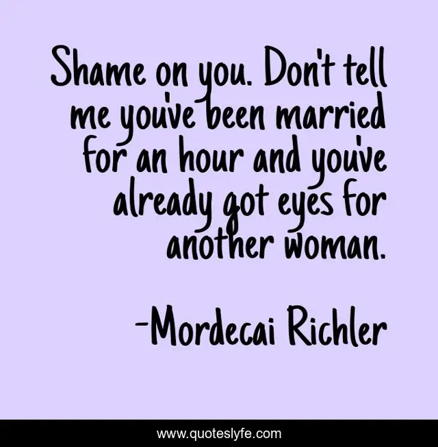 This page presents the quote "Shame on you. Don't tell me you've been married for an hour and you've already got eyes for another woman.". Author of this quote is Mordecai Richler. This quote is about true-love, humour, drunk, honeymoon, chastisement, debauchery, philandering, marriage, wedding,.