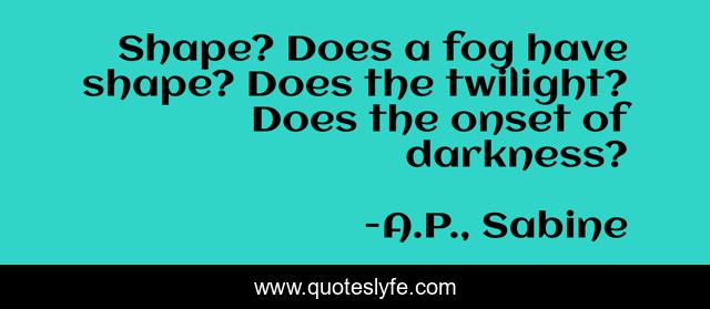 This page presents the quote "Shape? Does a fog have shape? Does the twilight? Does the onset of darkness?". Author of this quote is A.P., Sabine. This quote is about fog, twilight, darkness,.