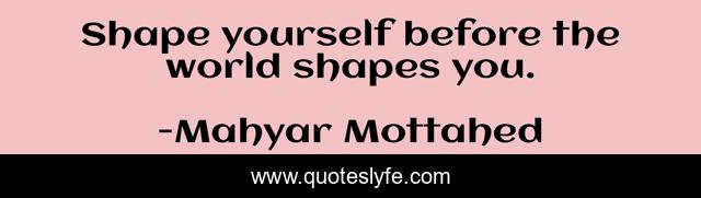 This page presents the quote "Shape yourself before the world shapes you.". Author of this quote is Mahyar Mottahed. This quote is about personal-growth, better-than-yesterday, work-on-yourself, inspirational, work-on-your-dream, personal-development, enthusiasm,.