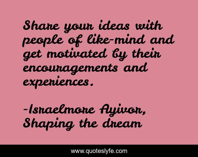 This page presents the quote "Share your ideas with people of like-mind and get motivated by their encouragements and experiences.". Author of this quote is Israelmore Ayivor, Shaping the dream. This quote is about food-for-thought, motivated, people, branding, brand, share, ideas, experience, mentors,.