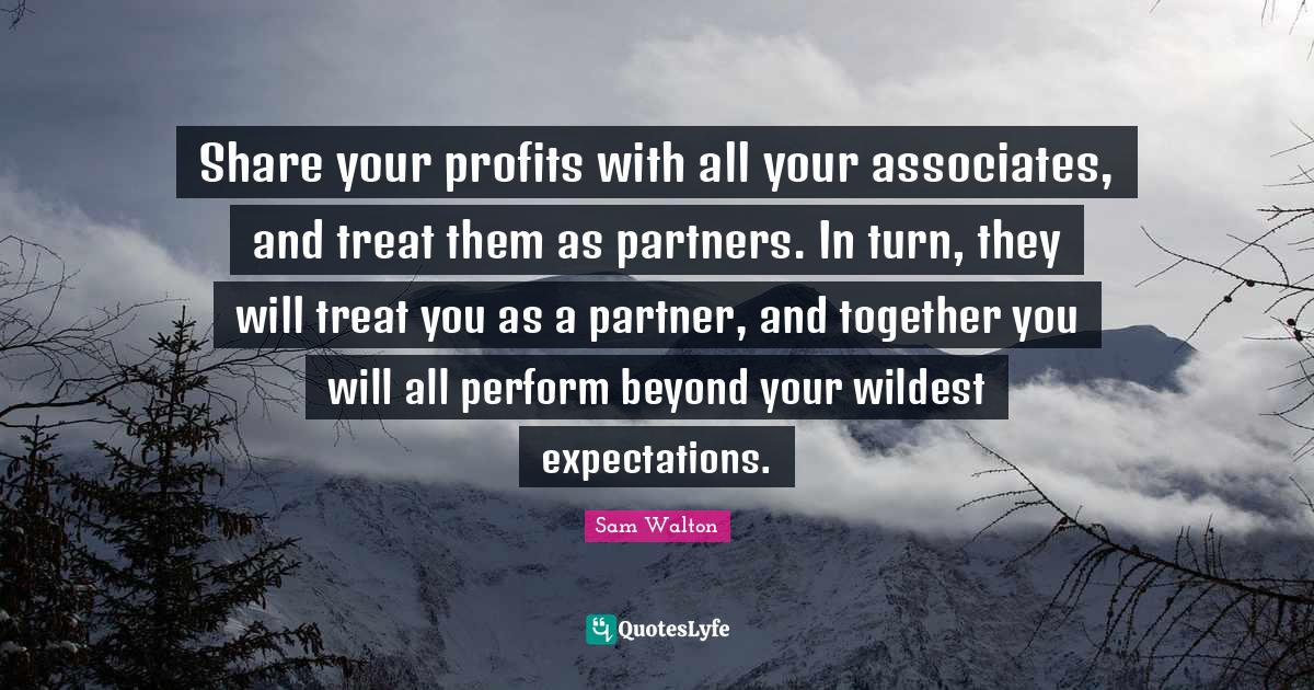 This page presents the quote "Share your profits with all your associates, and treat them as partners. In turn, they will treat you as a partner, and together you will all perform beyond your wildest expectations.". Author of this quote is Sam Walton. This quote is about share, together, associates, expectations, partners,.
