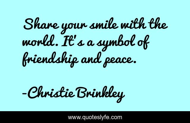 This page presents the quote "Share your smile with the world. It's a symbol of friendship and peace.". Author of this quote is Christie Brinkley. This quote is about smile, peace, happiness, world,.