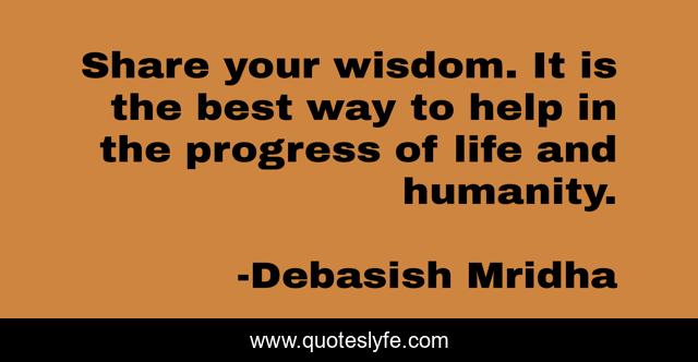 This page presents the quote "Share your wisdom. It is the best way to help in the progress of life and humanity.". Author of this quote is Debasish Mridha. This quote is about miraboli, oscar-wilde, progress-of-life, philosophy, debasish-mridha, share-your-wisdom, quotes, debasish-mridha-md, inspirational,.