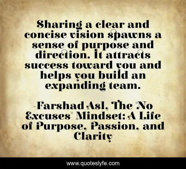 This page presents the quote "Sharing a clear and concise vision spawns a sense of purpose and direction. It attracts success toward you and helps you build an expanding team.". Author of this quote is Farshad Asl, The "No Excuses" Mindset: A Life of Purpose, Passion, and Clarity. This quote is about direction, success, concise, clear, purpose, vision,.