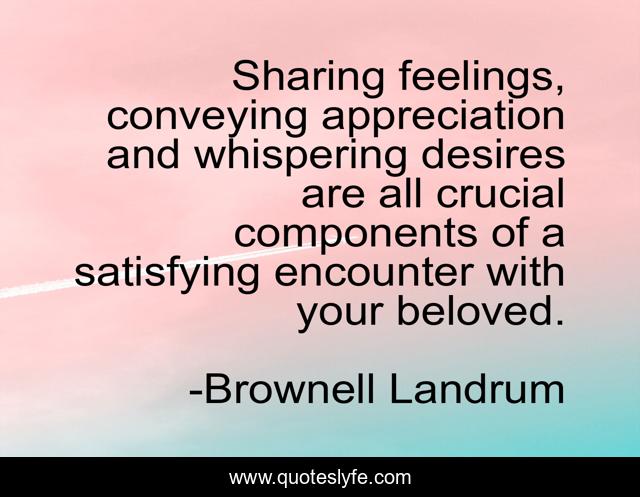 This page presents the quote "Sharing feelings, conveying appreciation and whispering desires are all crucial components of a satisfying encounter with your beloved.". Author of this quote is Brownell Landrum. This quote is about reincarnation, spiritual, love, affection,.
