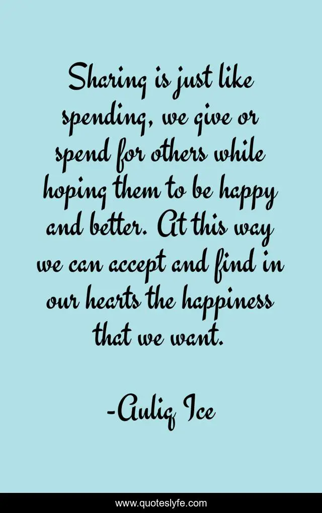 This page presents the quote "Sharing is just like spending, we give or spend for others while hoping them to be happy and better. At this way we can accept and find in our hearts the happiness that we want.". Author of this quote is Auliq Ice. .