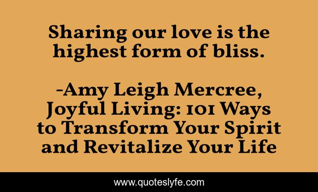 This page presents the quote "Sharing our love is the highest form of bliss.". Author of this quote is Amy Leigh Mercree, Joyful Living: 101 Ways to Transform Your Spirit and Revitalize Your Life. This quote is about quotes-de-la-vida, love, quote-of-the-day, quotes-for-instagram, quotes-tumblr, bliss, enthusiasm, inspirational, quote-about-life,.