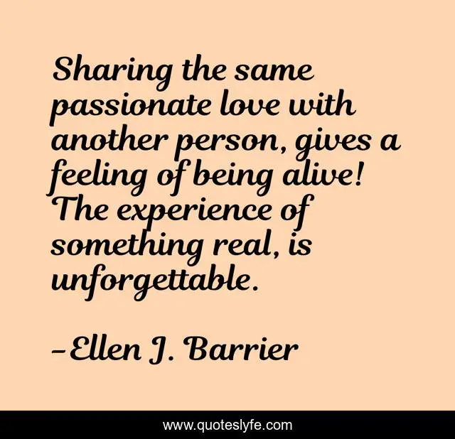 This page presents the quote "Sharing the same passionate love with another person, gives a feeling of being alive! The experience of something real, is unforgettable.". Author of this quote is Ellen J. Barrier. This quote is about relationships, affectionate, love, inspiration, intimate, romance, passion, inspirational, enthusiasm,.