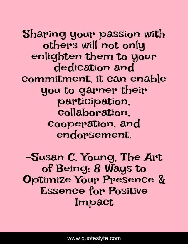 "Susan C. Young, The Art of Being: 8 Ways to Optimize Your Presence & Essence for Positive Impact Quotes." Quoteslyfe.com, 2025. Fri. 05 Dec. 2025. <https://www.quoteslyfe.com/quote/Sharing-your-passion-with-others-will-not-92381>.
