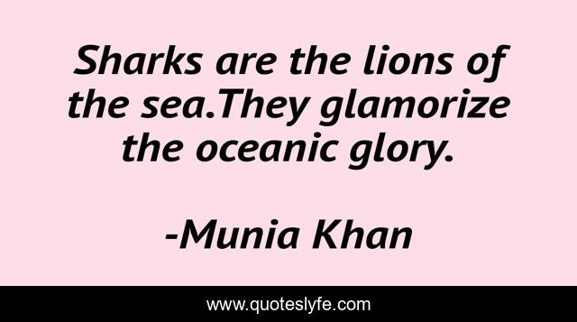 This page presents the quote "Sharks are the lions of the sea.They glamorize the oceanic glory.". Author of this quote is Munia Khan. This quote is about sharks, oceanic, glamorous, shark-week, glory, nature, shark, ocean, lions,.