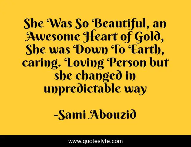 This page presents the quote "She Was So Beautiful, an Awesome Heart of Gold, She was Down To Earth, caring. Loving Person but she changed in unpredictable way". Author of this quote is Sami Abouzid. This quote is about love, affection,.