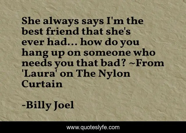 This page presents the quote "She always says I'm the best friend that she's ever had... how do you hang up on someone who needs you that bad? ~From 'Laura' on The Nylon Curtain". Author of this quote is Billy Joel. This quote is about lie, love, help, rude, fairweather, breakup, fix, violence, drug,.