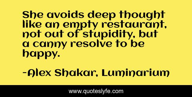 This page presents the quote "She avoids deep thought like an empty restaurant, not out of stupidity, but a canny resolve to be happy.". Author of this quote is Alex Shakar, Luminarium. This quote is about deep-thoughts, stupidity, happiness, shallowness,.