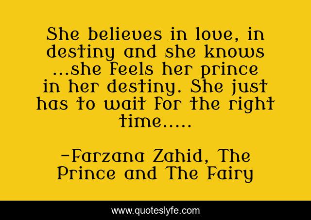 This page presents the quote "She believes in love, in destiny and she knows ...she feels her prince in her destiny. She just has to wait for the right time.....". Author of this quote is Farzana Zahid, The Prince and The Fairy. This quote is about heart, love, bookworm, prince, note, lovers, rose, romance, wattpadlife,.