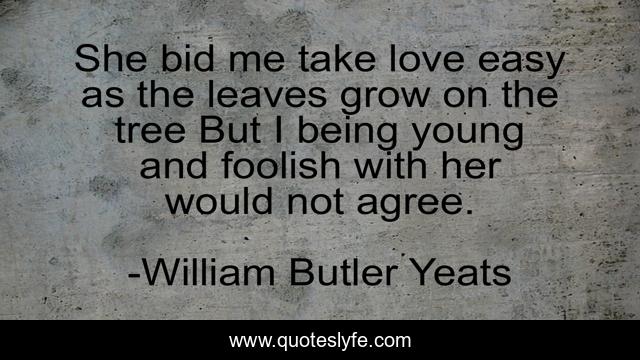 This page presents the quote "She bid me take love easy as the leaves grow on the tree But I being young and foolish with her would not agree.". Author of this quote is William Butler Yeats. .