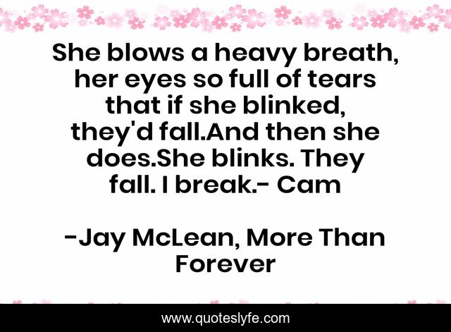 This page presents the quote "She blows a heavy breath, her eyes so full of tears that if she blinked, they'd fall.And then she does.She blinks. They fall. I break.- Cam". Author of this quote is Jay McLean, More Than Forever. This quote is about love, cameron-gordon, lucy, heartbreak, more-than-forever, affection,.