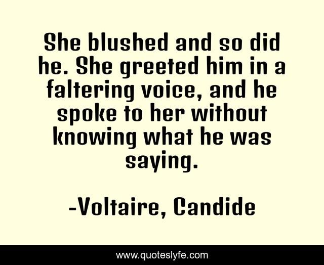 This page presents the quote "She blushed and so did he. She greeted him in a faltering voice, and he spoke to her without knowing what he was saying.". Author of this quote is Voltaire, Candide. This quote is about crush, love, affection,.