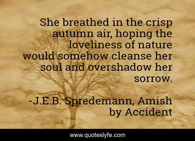 This page presents the quote "She breathed in the crisp autumn air, hoping the loveliness of nature would somehow cleanse her soul and overshadow her sorrow.". Author of this quote is J.E.B. Spredemann, Amish by Accident. This quote is about sorrow, nature,.