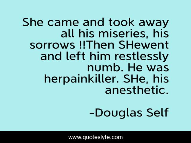 This page presents the quote "She came and took away all his miseries, his sorrows !!Then SHewent and left him restlessly numb. He was herpainkiller. SHe, his anesthetic.". Author of this quote is Douglas Self. This quote is about insane, love, numb, hurt, mistakes, worst, separation, pain, anesthesia,.