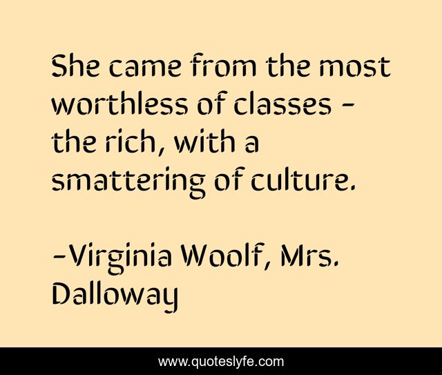 This page presents the quote "She came from the most worthless of classes - the rich, with a smattering of culture.". Author of this quote is Virginia Woolf, Mrs. Dalloway. This quote is about culture, irony, class, rich,.