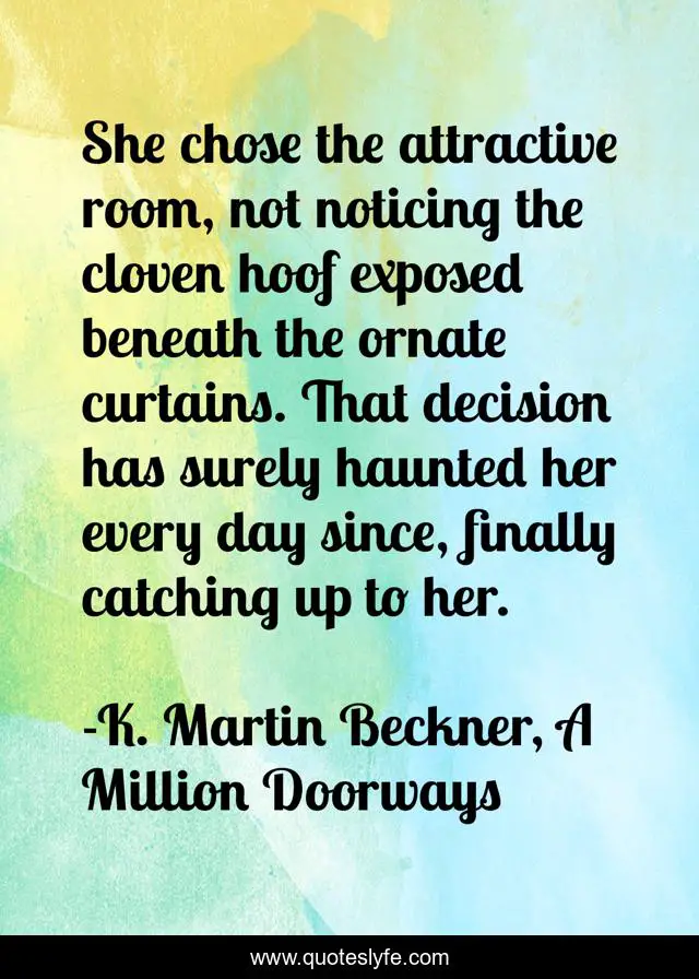 This page presents the quote "She chose the attractive room, not noticing the cloven hoof exposed beneath the ornate curtains. That decision has surely haunted her every day since, finally catching up to her.". Author of this quote is K. Martin Beckner, A Million Doorways. This quote is about regret, choices, mistakes, good-and-evil, healing, life-lessons, lifechanging, decisions, making-decisions,.