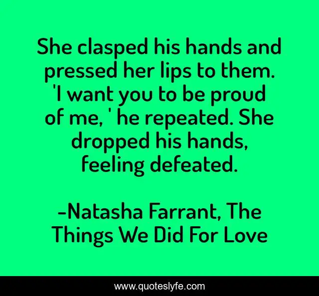 This page presents the quote "She clasped his hands and pressed her lips to them. 'I want you to be proud of me, ' he repeated. She dropped his hands, feeling defeated.". Author of this quote is Natasha Farrant, The Things We Did For Love. This quote is about bittersweet, love-forever, love-story,.