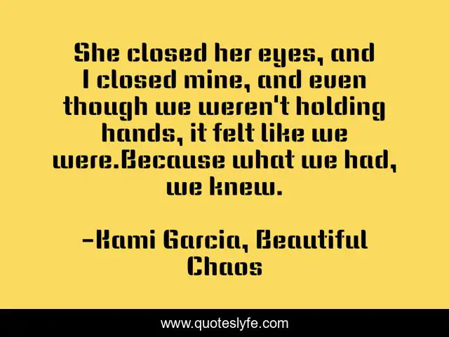This page presents the quote "She closed her eyes, and I closed mine, and even though we weren't holding hands, it felt like we were.Because what we had, we knew.". Author of this quote is Kami Garcia, Beautiful Chaos. This quote is about forever, love, comfort, holding-hands, affection, togetherness,.
