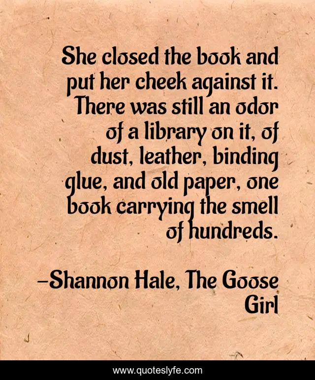 This page presents the quote "She closed the book and put her cheek against it. There was still an odor of a library on it, of dust, leather, binding glue, and old paper, one book carrying the smell of hundreds.". Author of this quote is Shannon Hale, The Goose Girl. This quote is about bibliophile, book-lover, books,.
