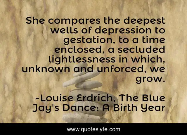 This page presents the quote "She compares the deepest wells of depression to gestation, to a time enclosed, a secluded lightlessness in which, unknown and unforced, we grow.". Author of this quote is Louise Erdrich, The Blue Jay's Dance: A Birth Year. This quote is about gestation, depression,.