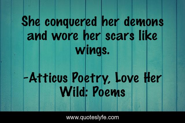 This page presents the quote "She conquered her demons and wore her scars like wings.". Author of this quote is Atticus Poetry, Love Her Wild: Poems. This quote is about love, instagram, her, atticuspoetry, poetry, quotes, wild, poems, atticus-poetry,.