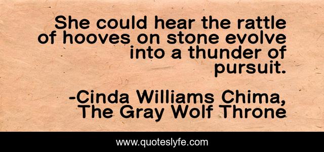 This page presents the quote "She could hear the rattle of hooves on stone evolve into a thunder of pursuit.". Author of this quote is Cinda Williams Chima, The Gray Wolf Throne. This quote is about chase, pursuit, danger,.