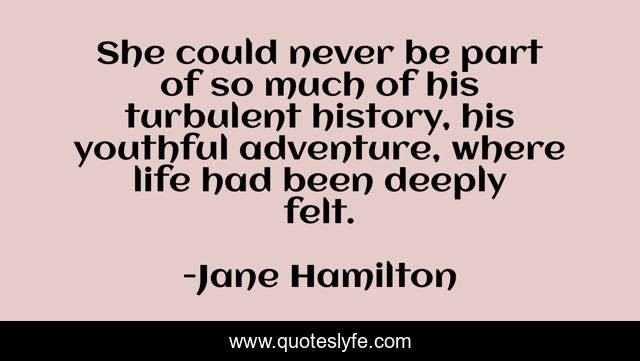 This page presents the quote "She could never be part of so much of his turbulent history, his youthful adventure, where life had been deeply felt.". Author of this quote is Jane Hamilton. .