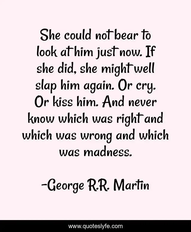 This page presents the quote "She could not bear to look at him just now. If she did, she might well slap him again. Or cry. Or kiss him. And never know which was right and which was wrong and which was madness.". Author of this quote is George R.R. Martin. This quote is about love, song-of-fire-and-ice, game-of-thrones, storm-of-swords, kiss, daenerys, affection,.