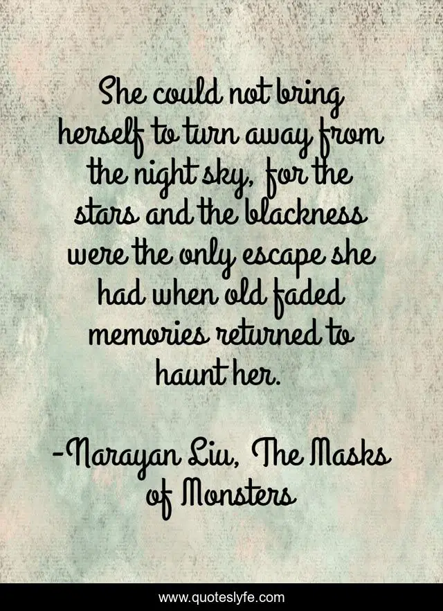 This page presents the quote "She could not bring herself to turn away from the night sky, for the stars and the blackness were the only escape she had when old faded memories returned to haunt her.". Author of this quote is Narayan Liu, The Masks of Monsters. This quote is about memories, immortality, night, vampire, regret,.