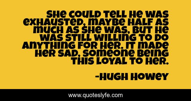 This page presents the quote "She could tell he was exhausted, maybe half as much as she was, but he was still willing to do anything for her. It made her sad, someone being this loyal to her.". Author of this quote is Hugh Howey. .