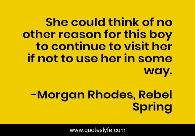 This page presents the quote "She could think of no other reason for this boy to continue to visit her if not to use her in some way.". Author of this quote is Morgan Rhodes, Rebel Spring. This quote is about boys, using-someone,.