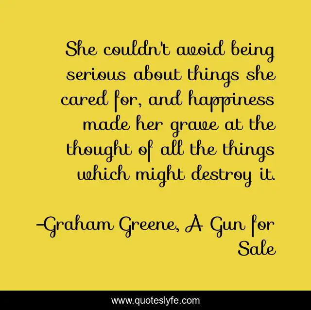 This page presents the quote "She couldn't avoid being serious about things she cared for, and happiness made her grave at the thought of all the things which might destroy it.". Author of this quote is Graham Greene, A Gun for Sale. This quote is about seriousness, happiness,.