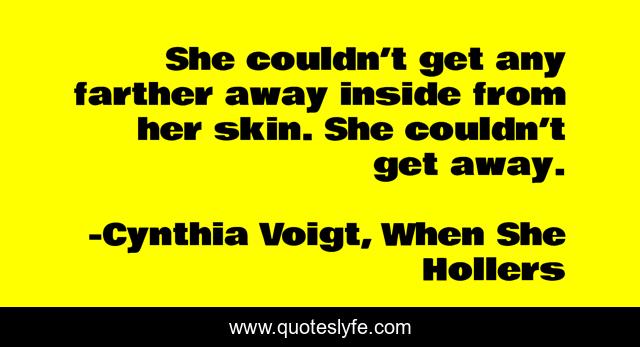 This page presents the quote "She couldn’t get any farther away inside from her skin. She couldn’t get away.". Author of this quote is Cynthia Voigt, When She Hollers. This quote is about teen, angst, incest, skin, girl, rape,.