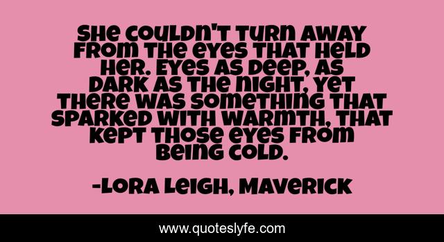 This page presents the quote "She couldn't turn away from the eyes that held her. Eyes as deep, as Dark as the night, yet there was something that sparked with warmth, that kept those eyes from being cold.". Author of this quote is Lora Leigh, Maverick. This quote is about desire, lora-leigh, lovers, love-at-first-sight, risa, micah,.